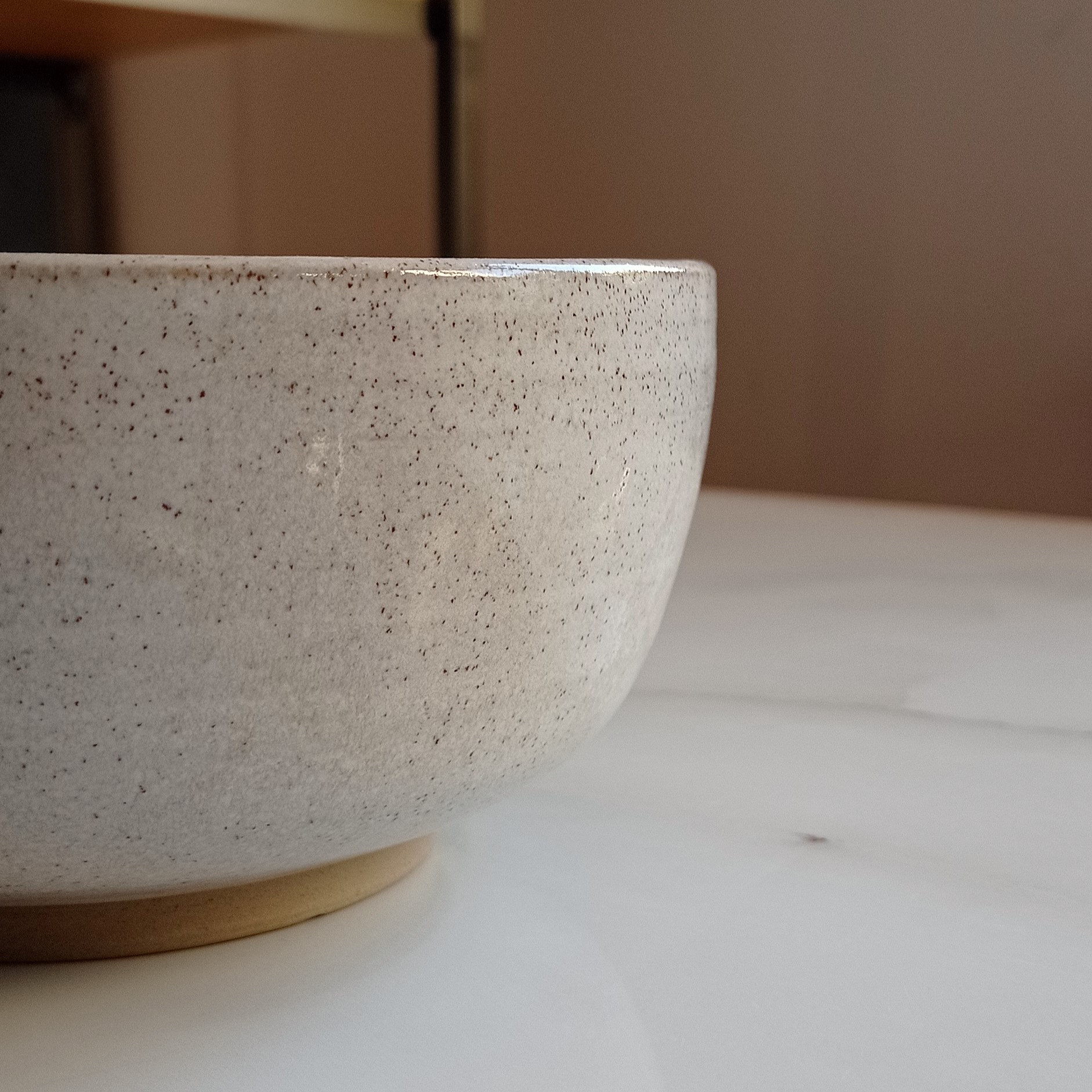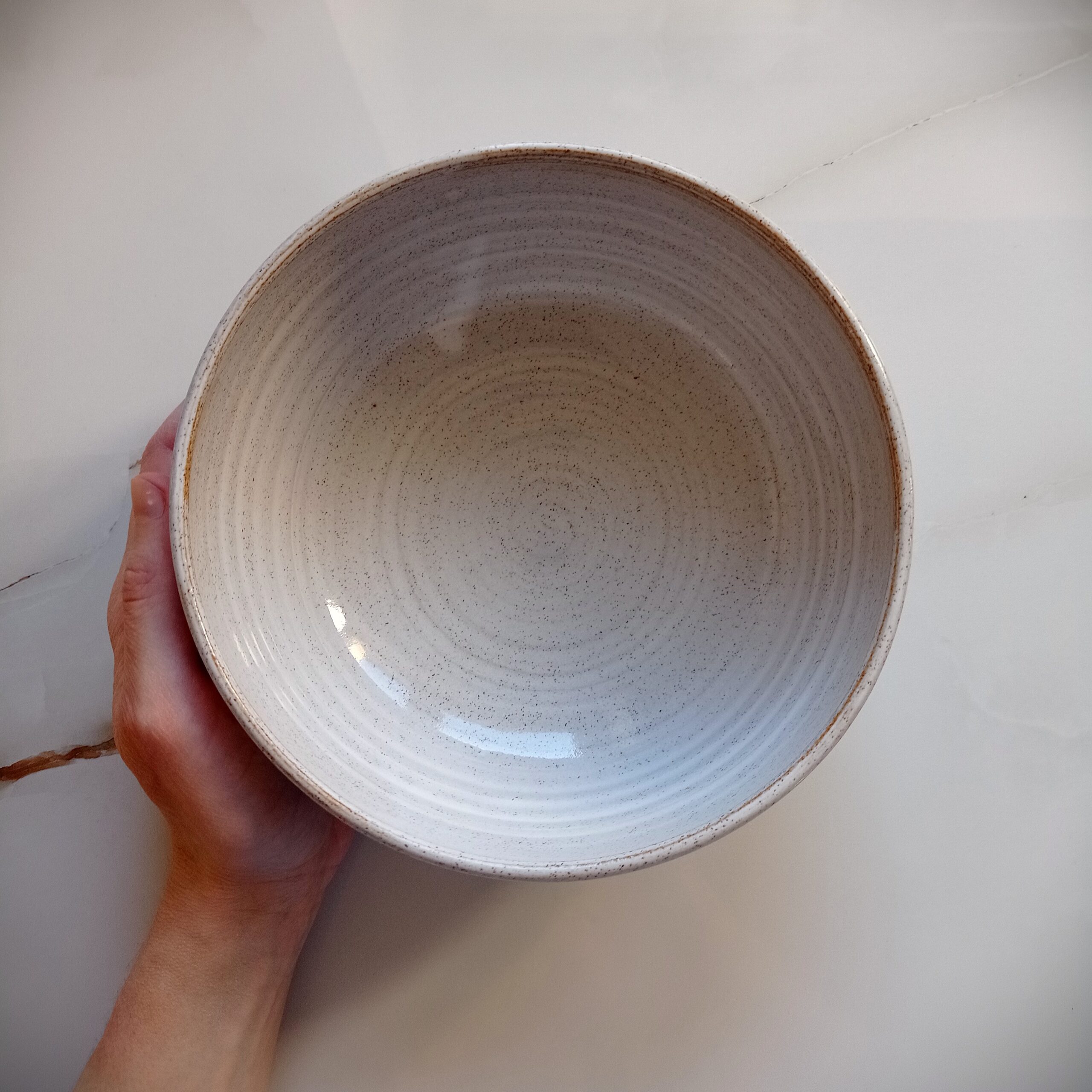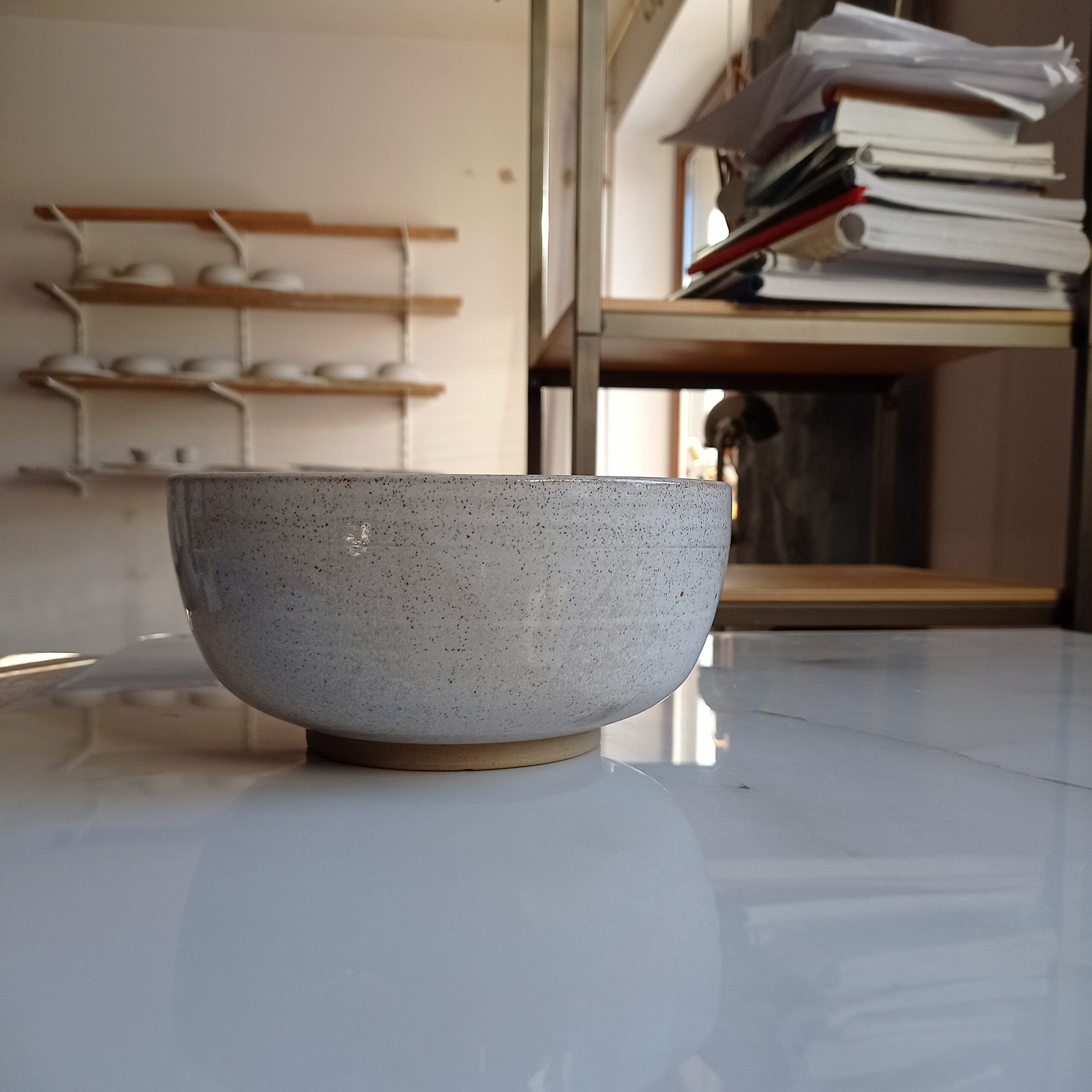 This bowl is made of a stoneware. It is glazed glossy inside and outside. Both textures – inside and outside are smooth. Dish was created on a throwing wheel. As a result of this type of production, pieces are very similar, but never the same – they may vary in dimensions, details in decoration or shape. All tableware foots’ are polished.